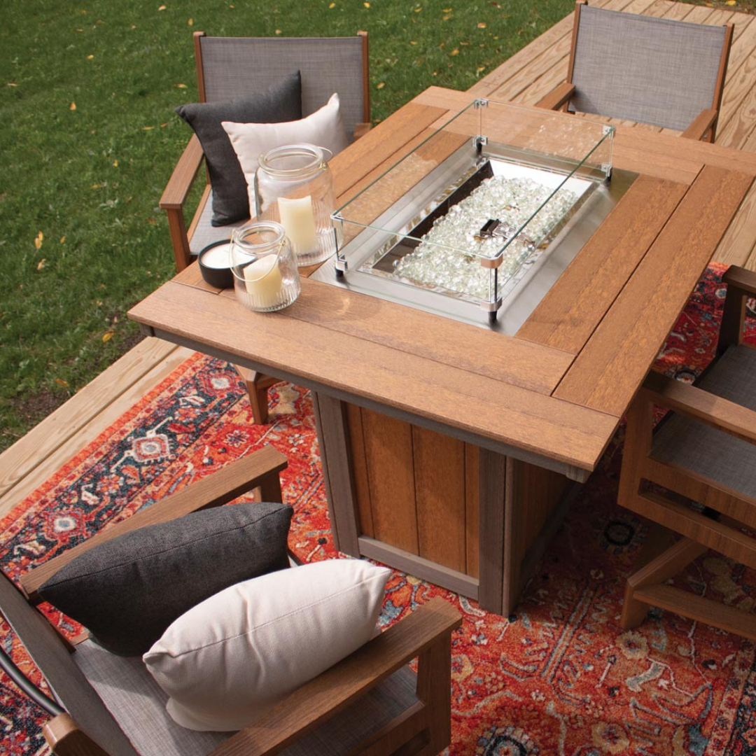 Melting and Stains: A Glass Wind Guard must be installed on Fire Pits at all times to keep flames from touching the material and avoid melting. Lighting or burning a fire pit without the glass wind guard installed may result in melting of the poly material and thus voids this warranty. If any colored liquids such as wine, or soft drinks are spilled on your top, clean immediately to avoid possible stains. Do not place flower pots or any items that will leave stains on fire pit. Do not place hot items directly on the top to avoid melting.
